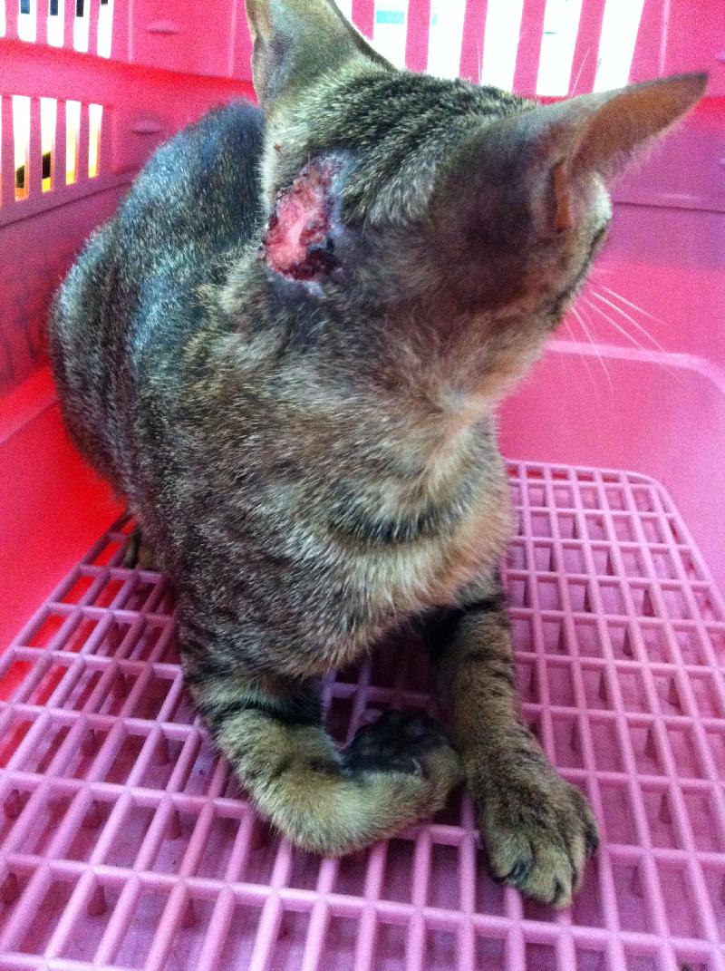 市場的貓咪,貓口數約保守估計至少20-30隻,平常會有管理員固定餵食,由於市場改建後,更方便汽機車通行,有時貓咪為了過馬路沒注意來車,常有貓咪慘死輪下事件發生,這隻貓咪誘捕到時背後脖子上有傷口,感謝醫師義務幫忙醫療傷口。(16)