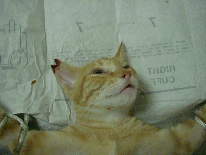 約五、六個月大的小橘子因為感冒嚴重,眼睛腫的很厲害、狂流眼淚,剛發現時有先跟醫院拿眼藥隔空點藥,但效果不佳,也愈來愈嚴重,將情況跟醫生說明後,醫生也覺得牠的眼睛蠻嚴重的,建議住院治療。由於是母貓,因此痊癒後也幫牠作了結紮手術休養後,才放回原地!