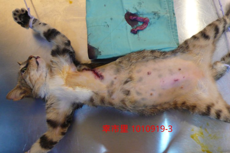 發現這母貓身上也有一處受傷,設籠誘捕,沒想到竟是先抓到另一隻公貓!因二隻長的很像,後來發現受傷母貓還沒落網,持續等待,在大雨不停中,籠子放在車下,終於落網,檢查化驗後,是一良性腫瘤,已經一並切除,並需另外申請醫助費用。