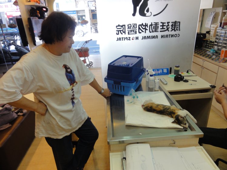 這貓是南海之貓愛媽之一蔡大姐,於住家附近所誘捕,這母貓之前生的小貓,就是前陣子申請醫助,尾巴被狗咬傷,爛尾的三花小貓,小貓們都長大了,母貓也又發情,蔡大姐將母貓紮了!免得又生小貓。