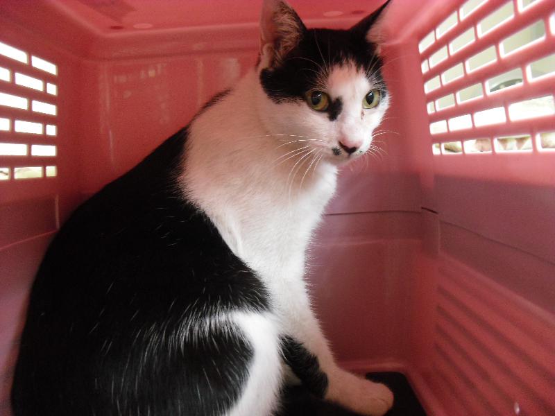 新貓~這個小朋友第一次來吃飯時會想撒嬌,可以摸摸,雖還有一點點的怕人,發現她是女生,培養了1~2天,用外出籠趁著吃飯時一把推了進去,看得出來他很不高興,但是結紮後,不必再淪為生產的機器,可以當個快樂的單生女郎ㄛ^^