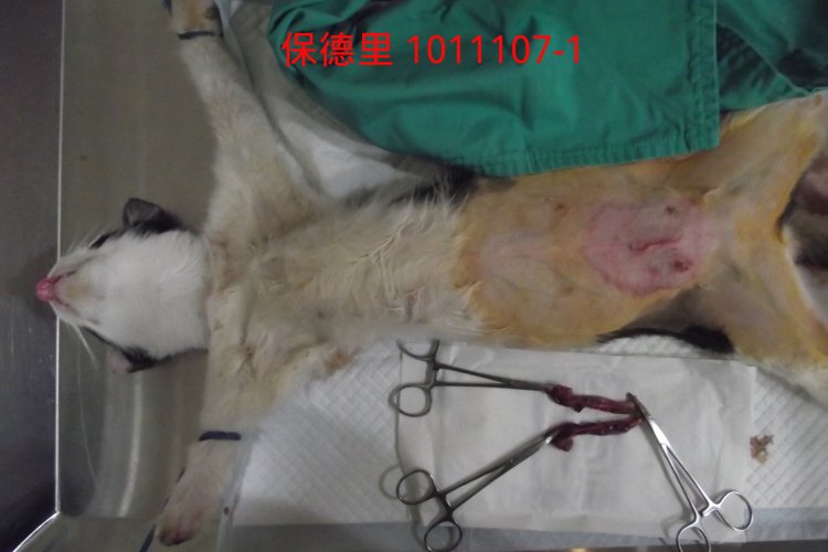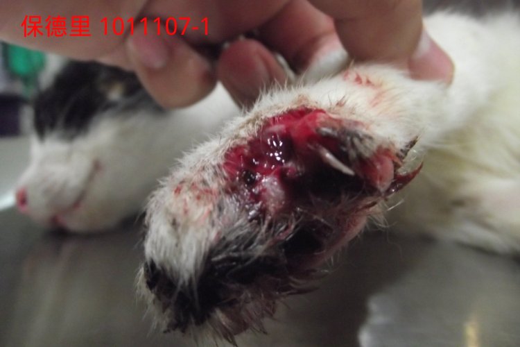 這是隻三腳母貓是由萬華區志工簡嘉小姐所誘捕,母貓還帶著小孩,在街上生活,誘捕時發現腳有流血,原以為進誘捕籠衝撞爪子受傷,麻醉後才發現,原來是腳掌潰爛,原已是三腳貓不良於行,一腳又潰爛,可能用原本斷的傷肢走路,導致斷掉的傷肢也破皮受傷,二腳都需要額外治療。