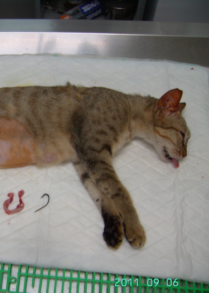 誘捕者暱稱: 蘇淑雅 性別: 母 花色: 淺棕虎斑 誘捕地點: 竹圍民生路145巷附近 結紮醫院: 哲生動物醫院 結紮費用: 1350 助紮者: 已付款:姆姆 額外醫療費用申請: 特別說明與誘捕心情: 本日最驚嚇..『什麼?!!..肚子裡竟然有魚鈎..』