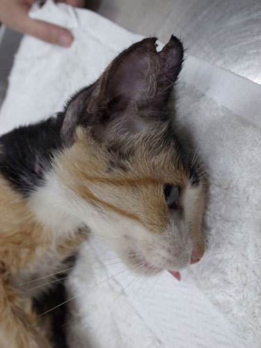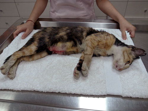 這隻三花母貓出沒約4、5個月,常躲著,兩個多月前看到生小貓,現在等小孩長大,趕快抓來結紮,強力生產線停產了。