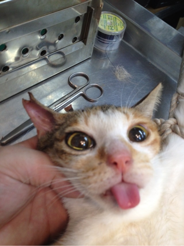 我哥哥是曾偉倫,已來信自我介紹過,此隻白黃斑貓為愛心媽媽定點在花蓮縣吉安鄉南海十一街246巷附近餵養,有幾隻因為餵食已久,跟愛媽感情深厚,故徒手就捕捉到,有幾隻戒心較重是用誘捕籠及網子捕捉到的,此次一共捕捉到6隻浪貓。