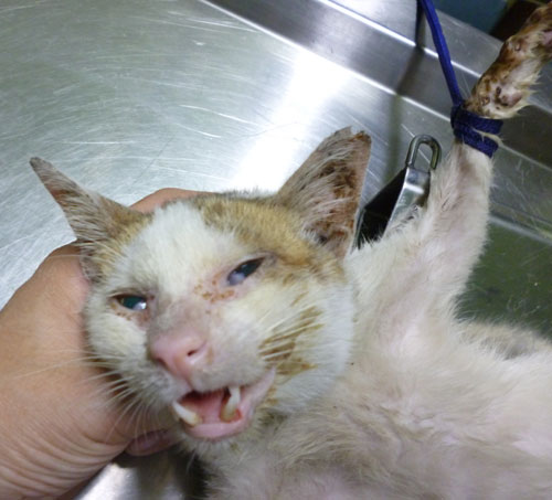 這隻貓看到時以為是小貓,因為很瘦小皮包骨,眼睛紅紅生病可憐模樣,醫院檢查後說是老貓,有愛滋、貧血、白血球5萬,等出院後會再申請醫助。