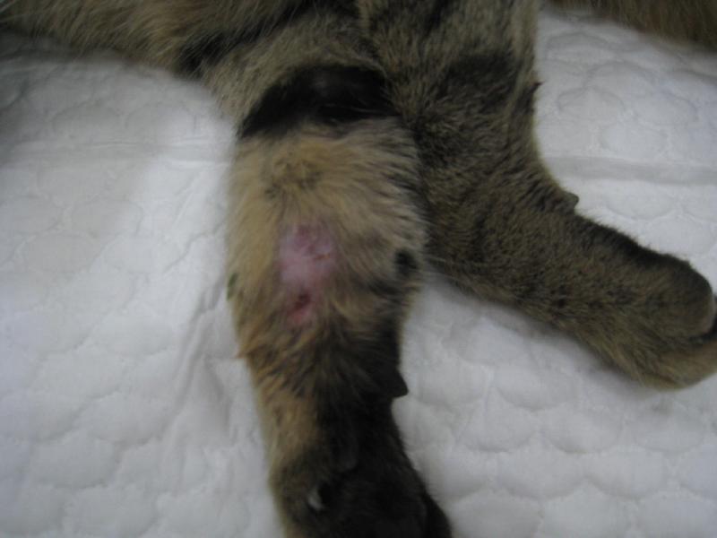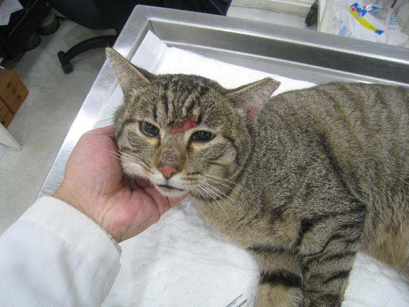 天玉街附近的豪宅社區,長期在誘捕街貓送收容所,經志工溝通後達成協議,一旦誘捕到貓即通知志工帶走,避免送進收容所安樂。這是其中一隻,前肢化膿病灶一併治療