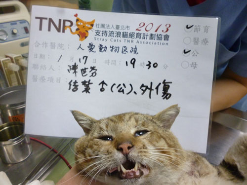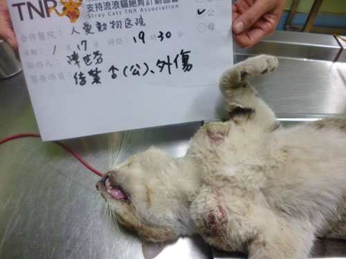 捕抓送院後,醫生檢查發現身上有疑似人為虐待傷口一大片,模樣可憐,難怪牠一直叫,可能是傷口不舒服,還好有提早抓到治療,以免傷口潰爛,需住院治療傷口,會再申請醫助。