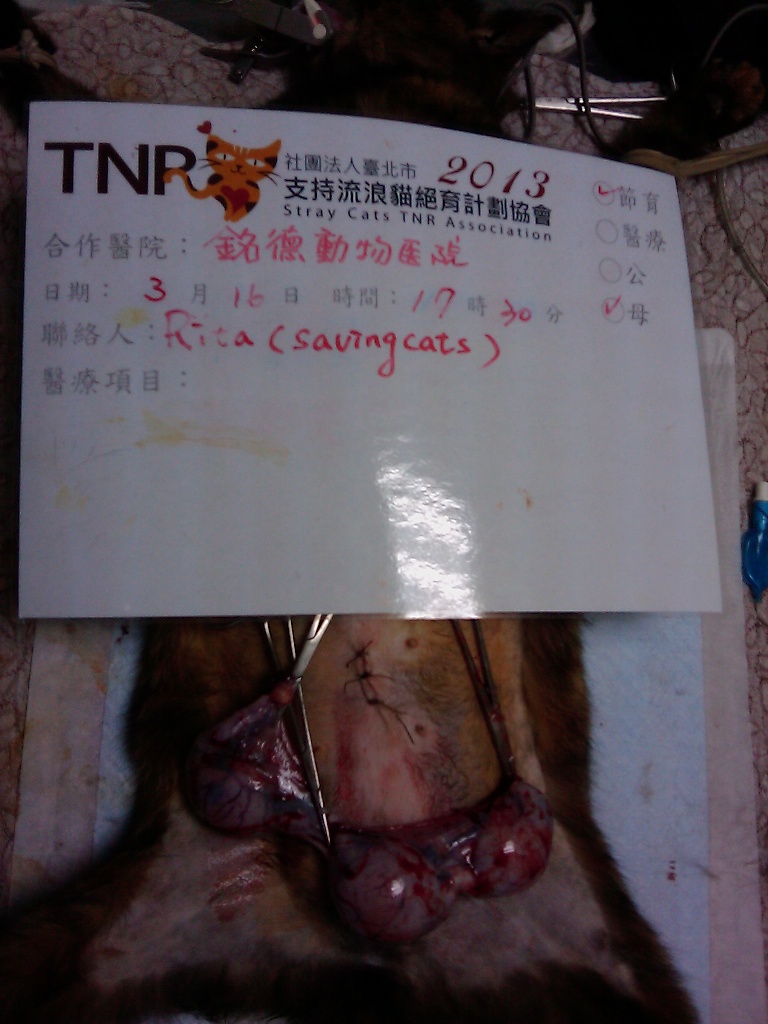 又是繁殖的季節,抓到的母貓總是會有已經受胎的,拿掉胚胎雖不人道,所幸這是剛成形的胚胎.對未來或會受苦的浪貓而言,或許這是良策.也望請各位助紮者的諒解.
