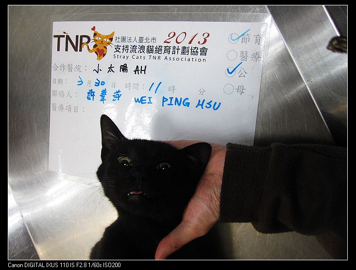 誘捕者暱稱: 噗MO 性別: 公 花色: 全黑 誘捕地點: 基隆市中正區 結紮醫院: 小太陽動物醫院 結紮費用: 900 助紮者: 已付款:Mei Yin Chenx1, 噗哩喵x1, 林雅雯x1 額外醫療費用申請: 特別說明與誘捕心情: 這一窩四隻貓是2012.9月出生的小貓