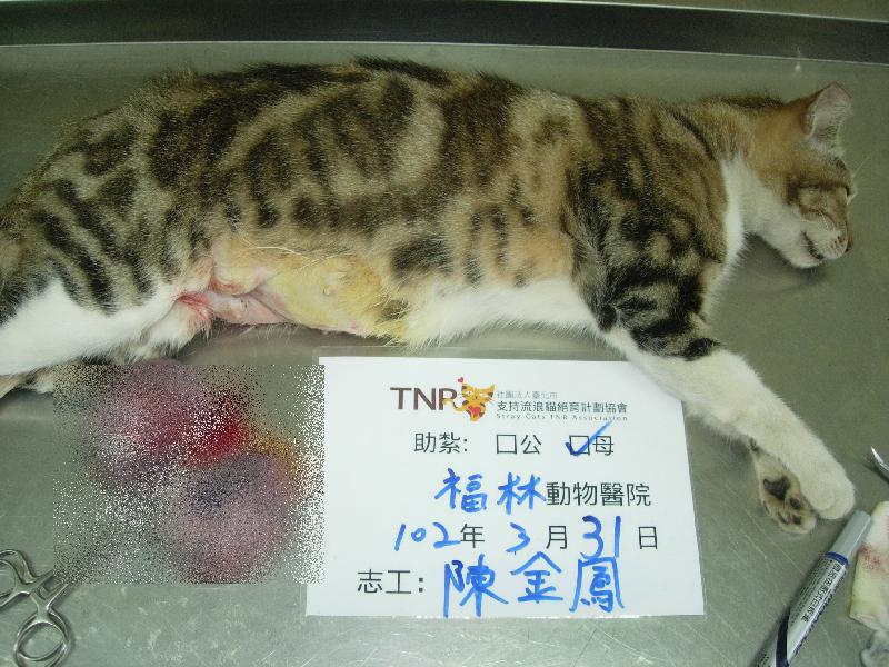 這隻貓是我家老愛媽餵養的浪貓群中的一隻,因餵養的貓越來越多,但卻沒有做結育,和她分享TNR的好處,加上已有鄰居因貓咪的聲音而抗議,請動物收容所來抓貓,所以積極著手幫這些浪貓一一結紮。讓浪貓們有個安身之所,媽咪也可以繼續餵養牠們!