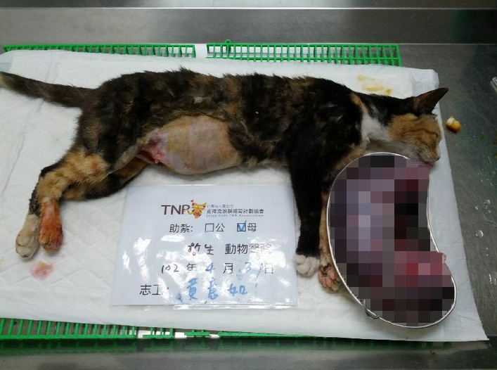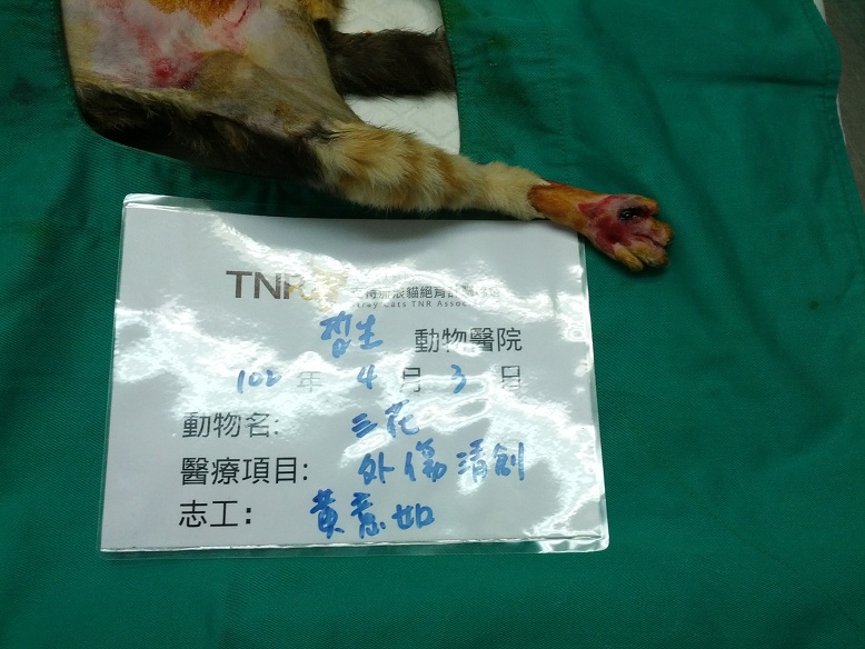 新北市淡水區大同路社區餿水桶附近新移入數隻成貓。都未結紮,夜裡打架影響社區安寧,著手捕捉送結紮。醫生發現三花母貓有發情及手掌三處深度膿包,順便進行清創手術。