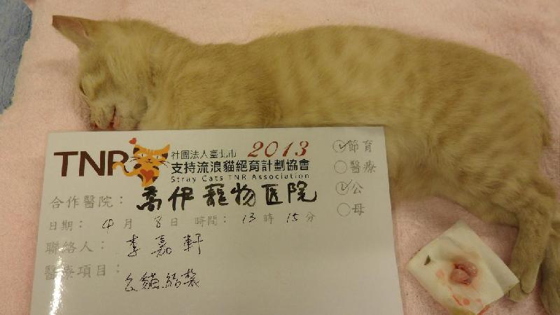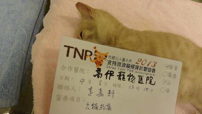 感謝協會幫助「新店北宜專案」的浪貓TNR計畫,於2013年4月7日晚上捉到5隻浪貓, 其中全橘公貓一隻,其餘都是母貓!由於住戶已反應附近浪貓太吵要處理貓咪,必須趕緊陸續帶整區貓咪們來結紮,因此特別感謝協會開設專案幫忙此區的浪貓,再次感謝協會以及所有愛心的助紮人!