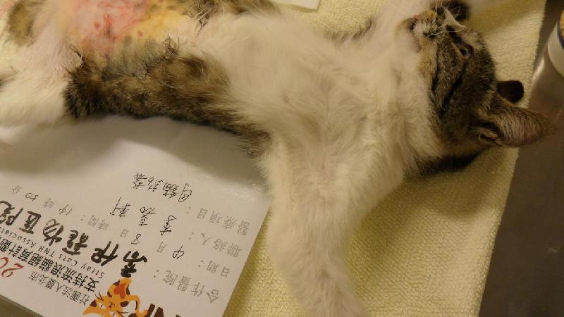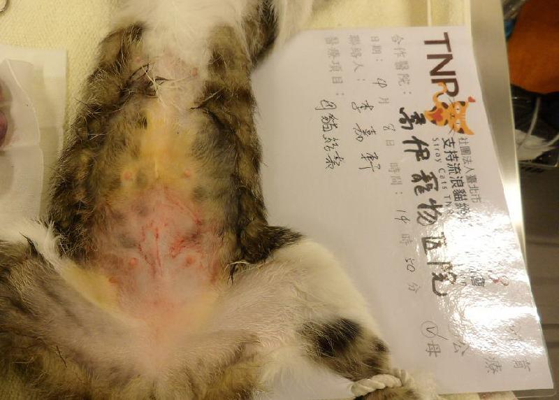感謝協會幫助「新店北宜專案」的浪貓TNR計畫,於2013年4月7日晚上捉到5隻浪貓, 其中這隻母貓是虎斑白底,鄰居抗議貓貓一直跑到屋頂上叫來叫去,很怕被抓走,趕緊抓來結紮,希望可以改善這區居民對貓咪的觀感,感謝協會開設專案幫忙此區的浪貓,再次感謝協會以及所有愛心的助紮人!