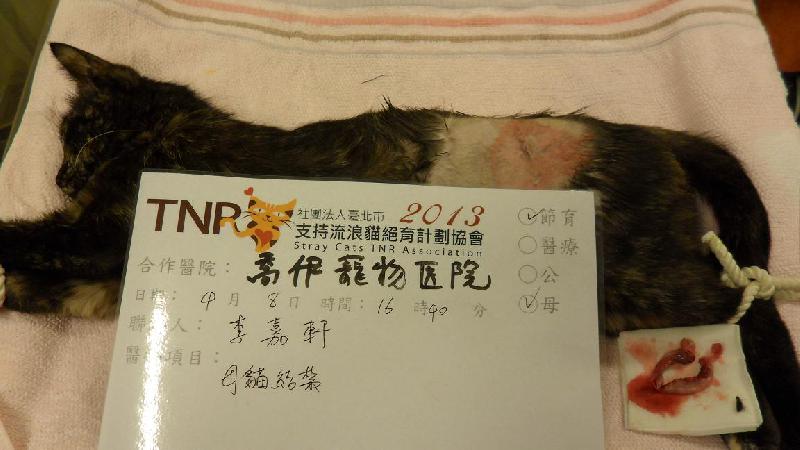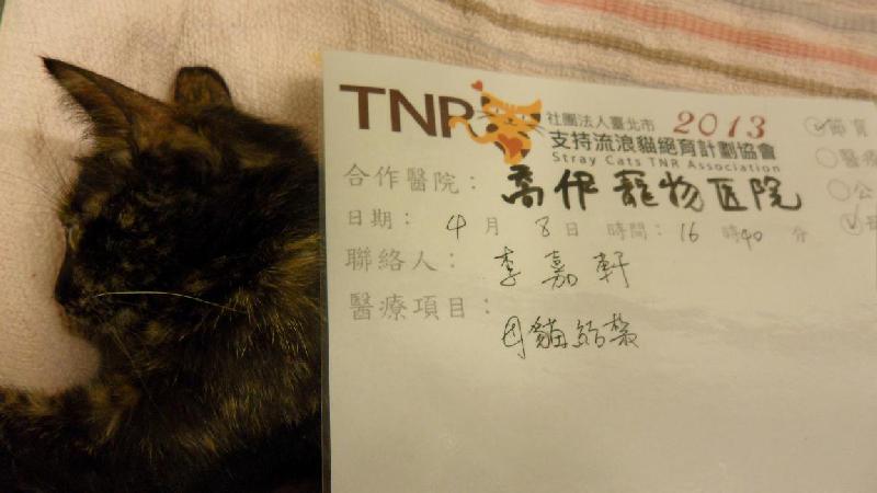感謝協會幫助「新店北宜專案」的浪貓TNR計畫,於2013年4月7日晚上捉到5隻浪貓, 其中這隻母貓是玳瑁,鄰居抗議貓貓一直跑到屋頂上叫來叫去,很怕被抓走,趕緊抓來結紮,希望可以改善這區居民對貓咪的觀感,感謝協會開設專案幫忙此區的浪貓,再次感謝協會以及所有愛心的助紮人!