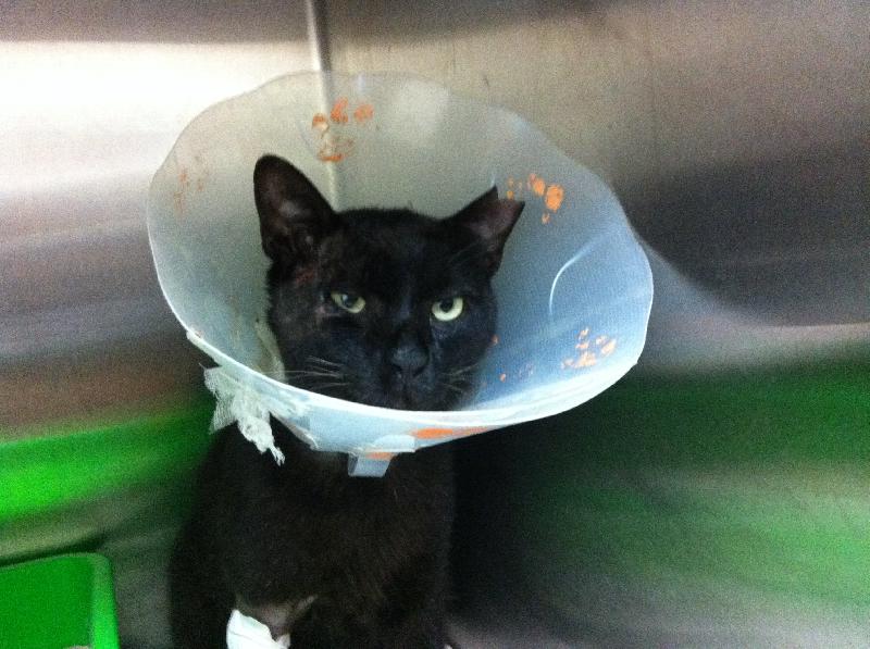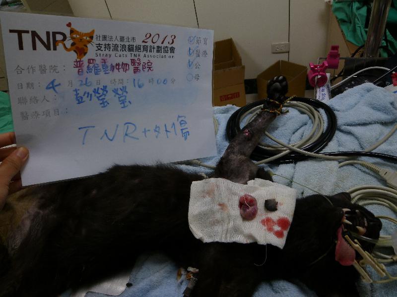 此貓因頭部有開放性傷口,經民眾向協會求援,由志工彭瑩瑩前往楊梅天下地下停車場誘捕。未曾施行過絶育手術,故於治療期間進行結紮。
