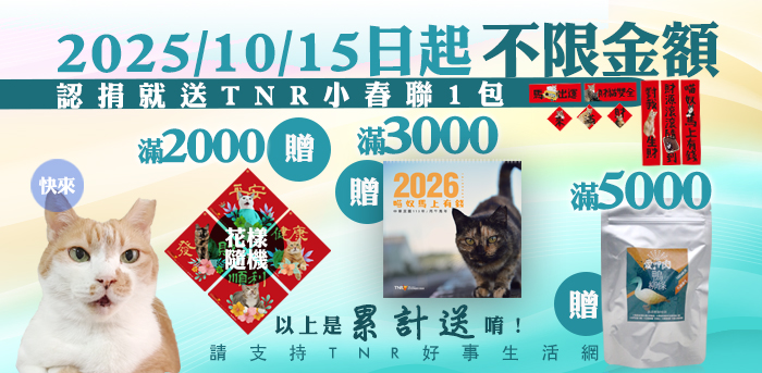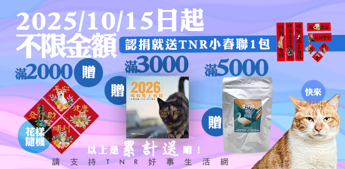 社團法人臺北市支持流浪貓絕育(TNR)計劃協會 版權所有 ©2011-2025. All Rights Reserved. 衛部救字字第1131364227號(期間114/01/01-114/12/31) TNR節育、醫療、助罐、對帳、收據、小額捐、贊助或是合作提案 地址:105台北市松山區八德路三段74巷13弄8號1樓