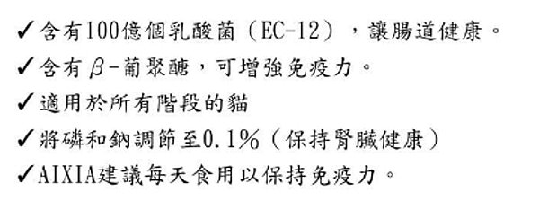 鰹魚,葵花籽油,水解蛋白蛋,寡糖,β-葡聚醣(來自麵包酵母),乳酸菌(滅菌型), 增黏安定劑(加工澱粉,黃原膠),維生素E